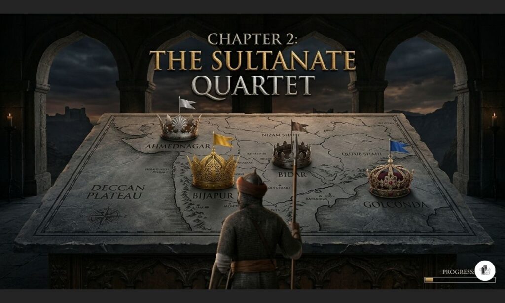 After the fall of Devagiri, the Deccan didn’t just become “poor.” It became a laboratory for foreign rule. The Bahmani Empire, which once ruled the south, shattered into pieces. By the late 1400s, four major Sultanates emerged. They were not just kingdoms; they were four different versions of the same struggle. To understand the world Shivaji Maharaj was born into, we must look at the “Minor Details” of these four crowns.
